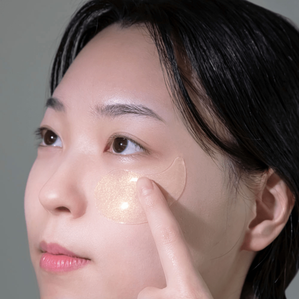 Máscaras para a área dos olhos com ouro embebidas em ampolas com peptídeos, alantoína e extrato de própolis para hidratar e tratar rugas e linhas finas na região dos olhos.